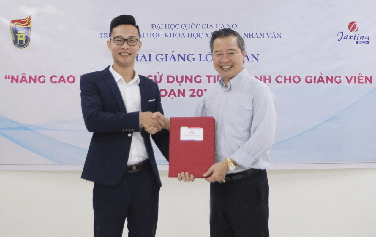 Với kinh nghiệm đào tạo tiếng Anh giỏi toàn diện cho người đi làm, Jaxtina English đã được Ban Giám Hiệu trường Đại học Khoa học Xã Hội và Nhân văn – Đại học Quốc Gia Hà Nội lựa chọn là đơn vị đào tạo các lớp thuộc đề án NÂNG CAO NĂNG LỰC SỬ DỤNG TIẾNG ANH CHO GIÁO VIÊN GIAI ĐOẠN 2018 – 2020. Hai lớp đầu tiên trong đề án đã được khai giảng thành công vào các ngày 15-16/07/2019 vừa qua.